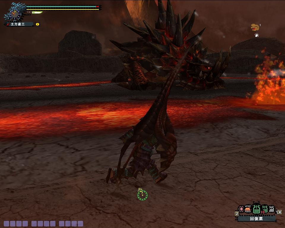 良く攻略サイトでは「避けて側面の死角から」などと歌われていますが、そんなものはランサー以外の攻略です。普通にガードしてやりましょう。何故態々ガードするかというと、フルフルの放電と同じで、なぎ払う火炎放射には一度しかダメージ判定が存在しません。つまり一度ガードしてしまえば、ランスでチャージしようが、ガンランスで龍撃砲を撃とうが、その火炎放射中は全てスルーできます。しかも正面でガードすれば普通に顔面に攻撃し放題なので、火炎放射がきそうなら無理してでもガードしにいくようにしましょう。