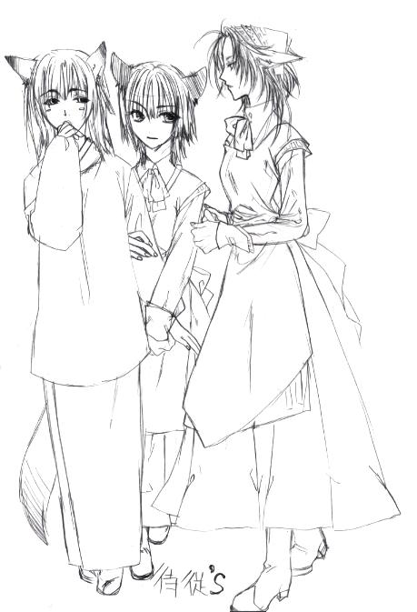 向かって右から灰犬メイド「クドリャフカ」、真ん中が黒猫侍従「ジェイド」、一番左が女狐家政婦「アンバー」…