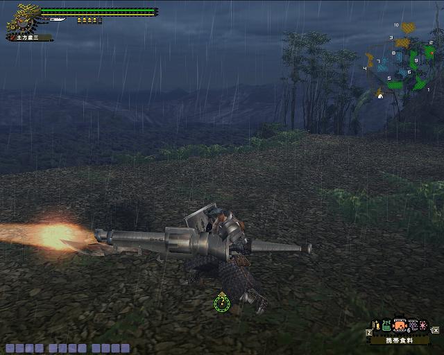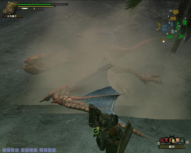 戦い方としては基本ガードでちくちく突付き(深追いすると尻尾怖いからぬ)相手が突進してきたタイミングでそれを受けきり、必殺の竜撃砲(ガンランスのフェイバリットホールド。出るまでは遅いが、超強烈な砲撃を打ち込む。射撃した後ガンランスの冷却弁ががしゃんと展開して冷却を開始するのが異様にカッコイイ)をどごーンッ!準備万端で閃光玉も持っていった為、それでぴよらせた所に竜撃砲どごーンッ!