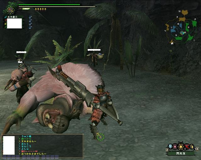 ババコンガはおとついソロで立ち向かい、開始5分で2回死(クエは3回死んだら失敗になる)、その10分後くらいに一撃で体力の半分以上を刈り取られ、結局クエ失敗…どころかぽっきり心を折られて、ふらふらチャットに慰めにもらいに行く始末(だめン)。昨日の4人PTにしても、討伐成功までに2度叩き潰されているという有様で…